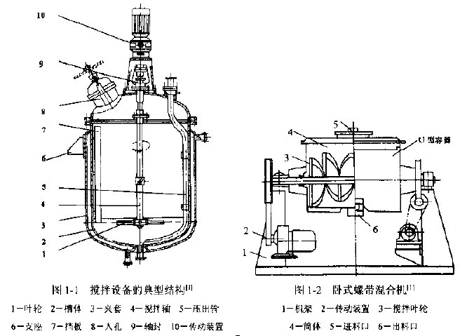混合機的槽體的型式通常是立式圓筒形的,圓筒上部和下部都有蝶形或橢圓形的封頭,如圖1-1。也是一些混合機械是臥式的,像圖1-2.混合機的立式槽在常壓下操作時,為降低槽體的制造成本,混合機的槽上部也可是敞口的。磷肥工業(yè)、濕法冶金業(yè)和污水處理業(yè)用的數百或數千立方米的大型混合機攪拌槽,絕大多數是敞口的平底混合機攪拌槽。在攪拌含有較大顆粒的淤漿時,為了便于固體粒子的出料,常用錐形底的混合機攪拌槽。圖1-3中槽體是圓錐形的。使用螺帶式葉輪,它能混合高粘液體或粉體,與用立式圓筒形槽體的螺帶式攪拌機相比,它混合效率更高。 在臥式混合機攪拌槽中大多進行半斧操作,因此臥式斧與立式斧相比有更多氣夜接觸面積,故臥式常用于氣夜傳質過程,像氣夜吸收或從高粘液體中脫除少量易揮發(fā)物質;另一方面,臥式的料層較淺,有利于葉輪將粉末攪動,并可借混合機葉輪的高速回轉使粉體拋揚起來,使粉體在瞬間失重狀態(tài)下進行混合。 臥式混合機的攪拌設備有單軸的,也有雙軸的,像圖1-4.采用臥式雙軸攪拌設備的混合機目的是要使攪拌器獲得自清潔效果。當攪拌高粘液體時,若葉輪端部與槽壁有一定的間隙,則高粘液體會滯留與間隙中,這些滯留物的存在往往影響產品的質量。特別當混合機的攪拌設備作為反應器使用時,滯留物因反應時間過長或局部過熱而變質。為此,攪拌高粘液體的葉輪的外緣都與槽壁很接近,有時還在混合機的葉輪裝刮刀,即所謂刮壁式混合機攪拌設備。然而,即使采用了刮壁式混合機攪拌器,若采用單軸型混合機,高粘液體還可能粘滯在葉輪上,隨葉輪一起轉動,而若采用自清潔型的臥式雙軸混合機攪拌設備,通過兩支軸上特殊設計的混合機葉輪的齒合,使葉輪之間產生互相清潔作用,可使滯留物減至最少。